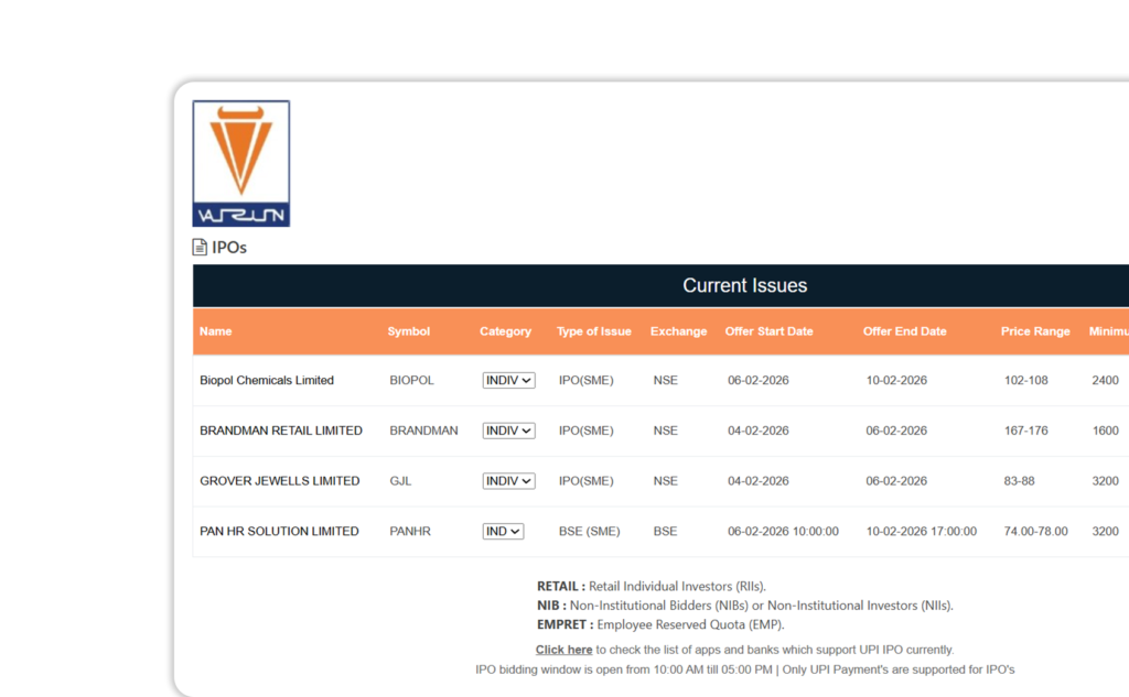 Clients can apply for IPOs through our platform using ASBA-compliant processes, ensuring transparency and direct participation in primary market offerings.